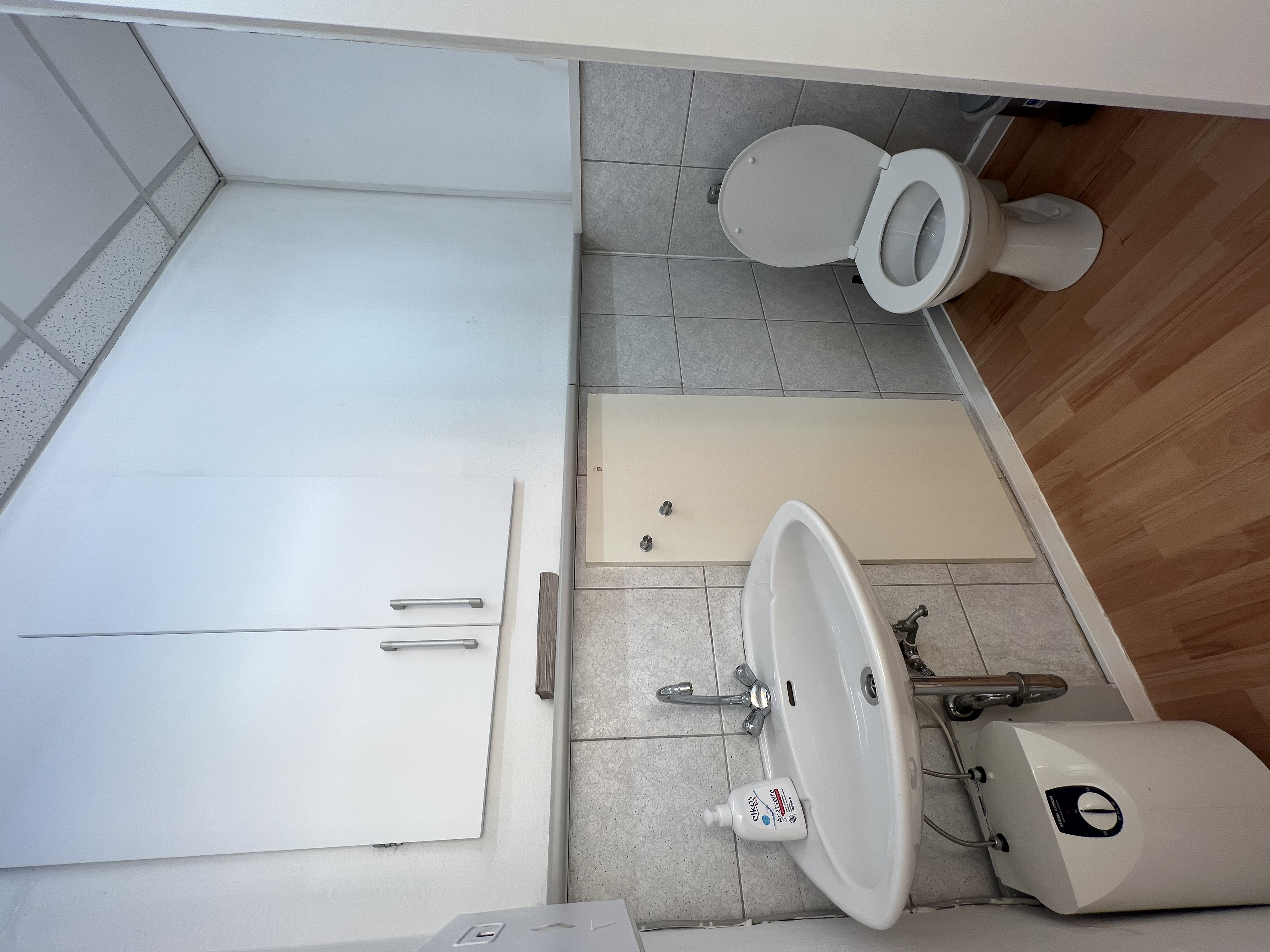 Unter anderem gibt es ein kleines WC mit Waschbecken sowie eine kleine Nische für eine Küchenzeile.
