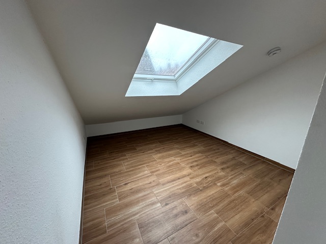 Dieser Dachgeschosswohnung mit Schrägen umfasst 2 Zimmer, eine offene Küche mit Einbauküche, ein Bad mit Dusche sowie einer kleinen Kammer und einem Balkon.Für die Einbauküche fallen zusätzlich monatlich 50.- Euro an.
