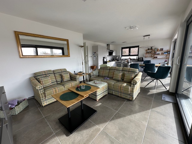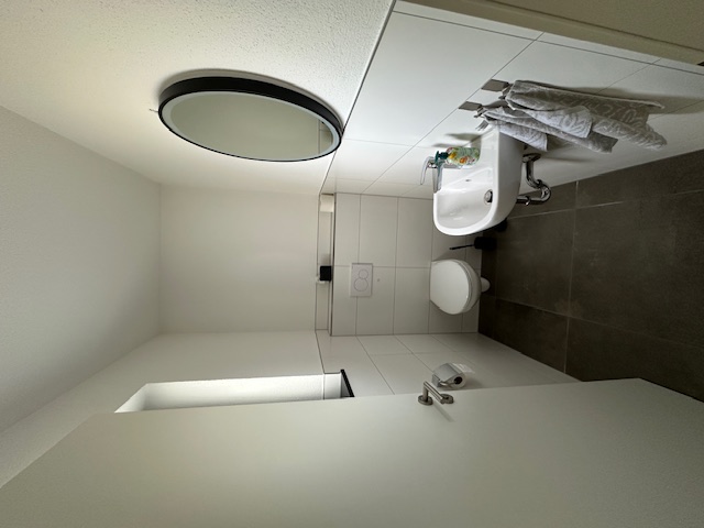 Das Tageslichtbad ist mit einer ebenerdigen Dusche, einem Waschbecken sowie einem WC ausgestattet. Zusätzlich steht ein separates Gäste-WC zur Verfügung. Ein praktischer Hauswirtschaftsraum innerhalb der Wohnung bietet weiteren Stauraum und Platz für Waschmaschine und Trockner.