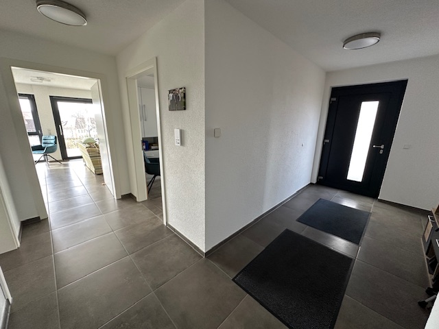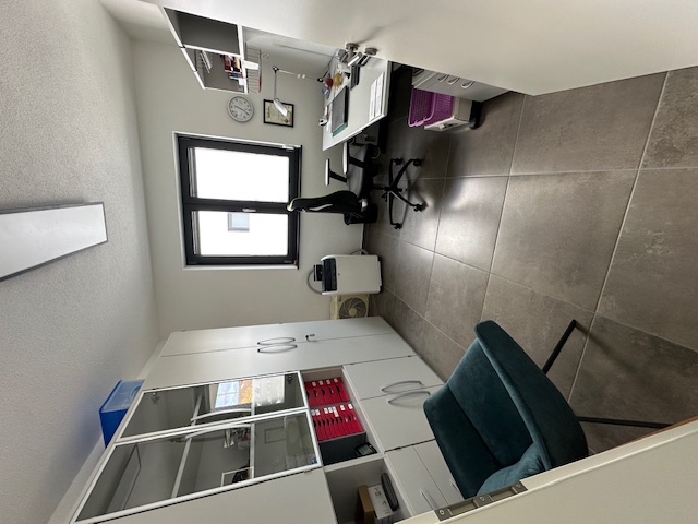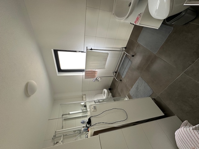 Das Tageslichtbad ist mit einer ebenerdigen Dusche, einem Waschbecken sowie einem WC ausgestattet. Zusätzlich steht ein separates Gäste-WC zur Verfügung. Ein praktischer Hauswirtschaftsraum innerhalb der Wohnung bietet weiteren Stauraum und Platz für Waschmaschine und Trockner.