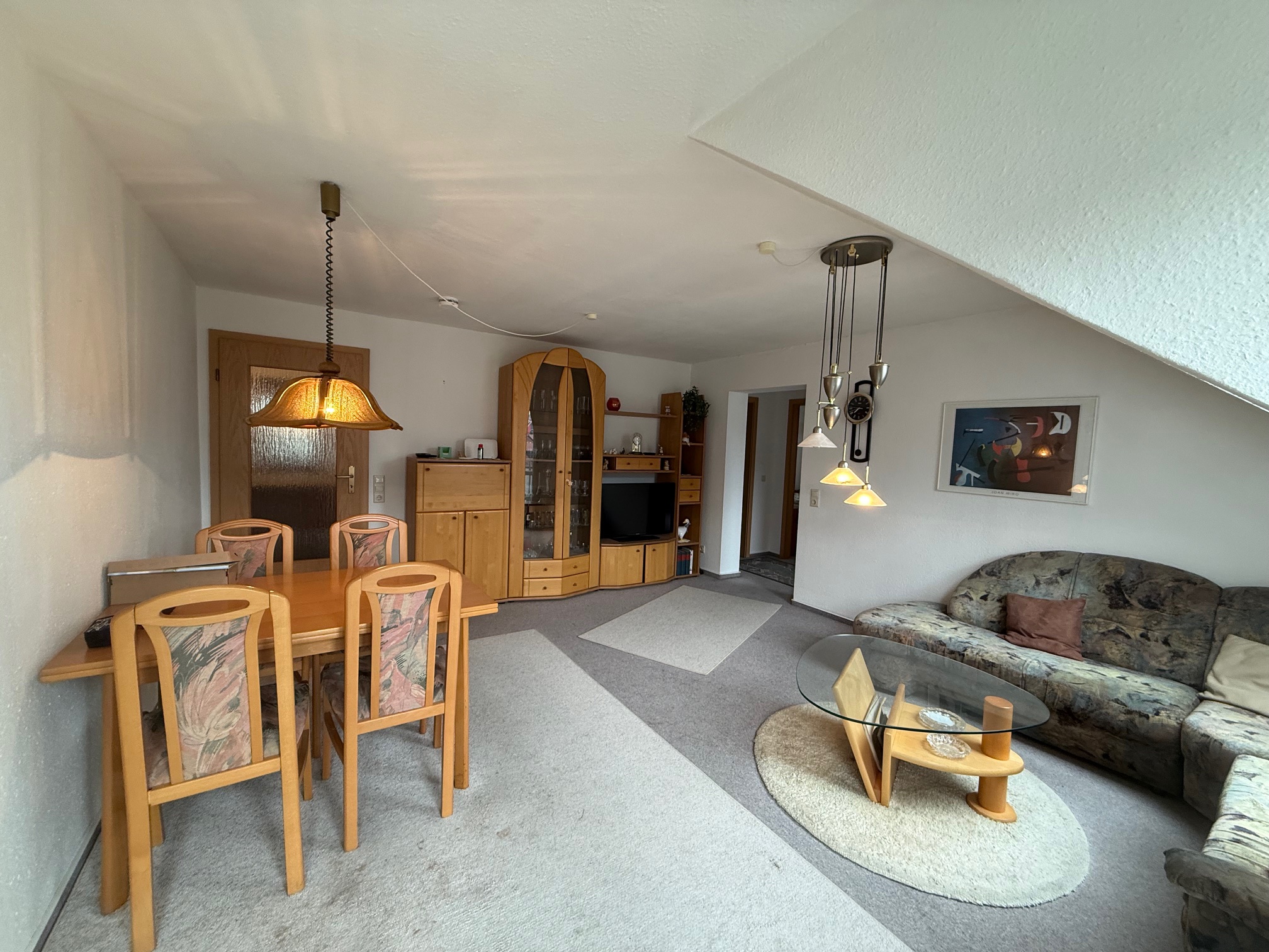 Diese gut geschnittene 4-Zimmer-Maisonette-Wohnung befindet sich im Dachgeschoss eines gepflegten Mehrfamilienhauses und bietet mit ihrer durchdachten Raumaufteilung ein angenehmes Wohnambiente auf ca. 80 m² Wohnfläche.Im unteren Bereich erwarten Sie zwei Schlafzimmer sowie der großzügige und lichtdurchflutete Wohn- und Essbereich mit direktem Zugang zum Balkon. Die separate Küche ist mit einer Einbauküche ausgestattet, die bei Interesse gerne übernommen werden kann.